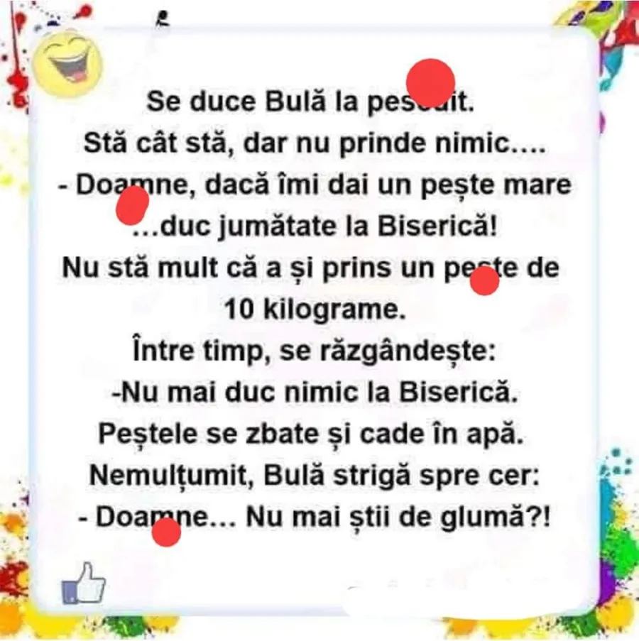 – Doamne, dacă îmi dai un pește mare… duc jumătate la Biserică!