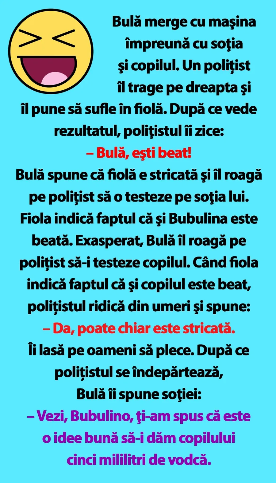 Dragă cititorule, CANCAN.RO ți-a pregătit un banc de nota 10. Bulă mergea cu mașina împreună cu soția și copilul, iar la un moment dat este oprit de poliție și pus să sufle în etilotest. Vezi care este reacția agentului rutier atunci când vede rezultatul apărut pe fiolă.