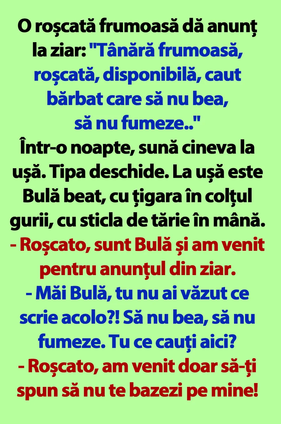 O roșcată frumoasă dă anunț la ziar: „Tânără frumoasă, roșcată, disponibilă caut bărbat care să nu bea, să nu fumeze..” Într-o noapte, sună cineva la ușă. Tipa deschide. La ușă este Bulă beat, cu țigara în colțul gurii, cu sticla de tărie în mână.