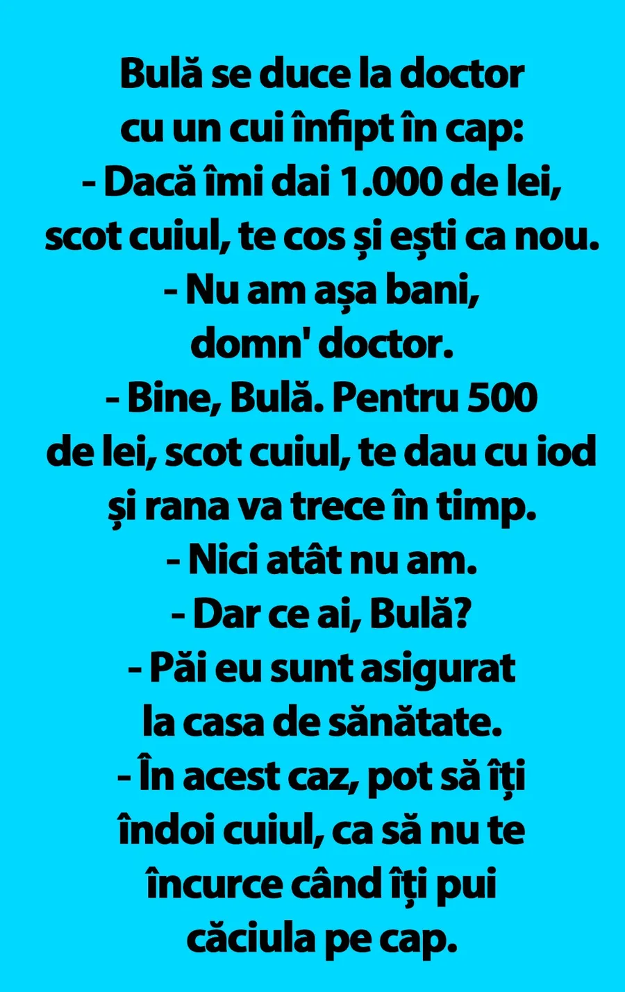 Banc. Ajunge Bulă la doctor cu un cui înfipt în cap. Dialogul cu medicul stârnește amuzamentul. Spor la râs, dragi cititori!