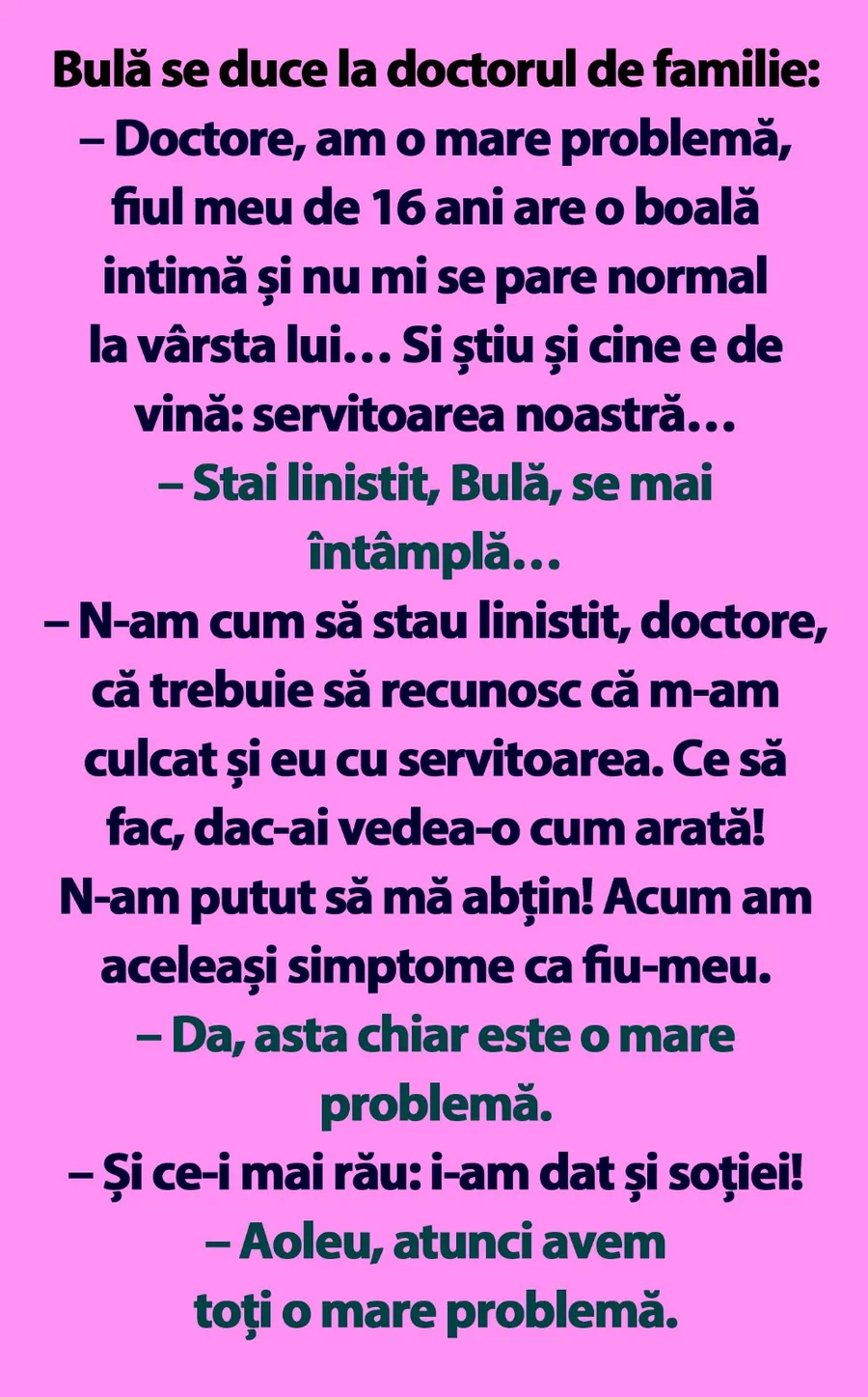 – Doctore, am o mare problemă, fiul meu de 16 ani are o boală intimă și nu mi se pare normal la vârsta lui… Si știu și cine e de vină: servitoarea noastră…