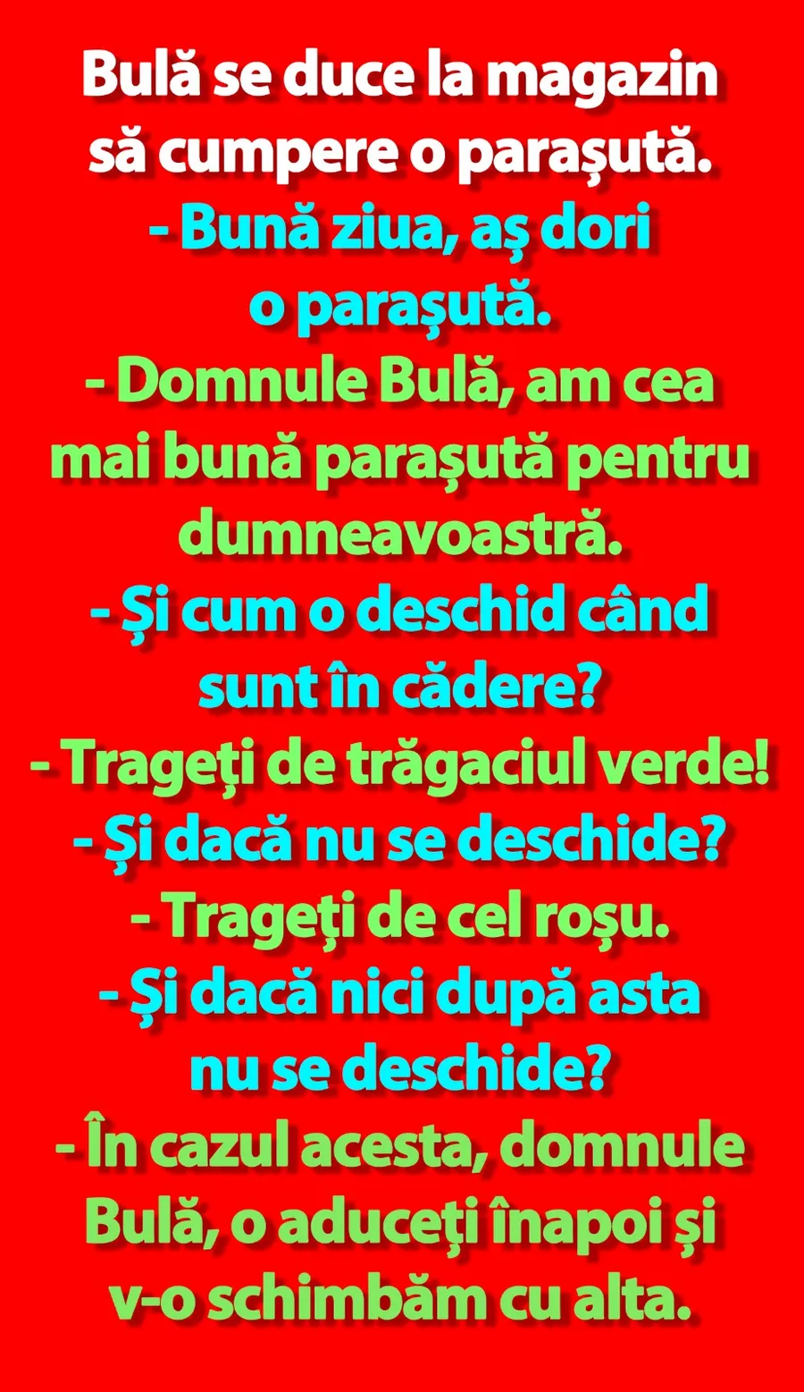 – Domnule Bulă, am cea mai bună parașută pentru dumneavoastră.