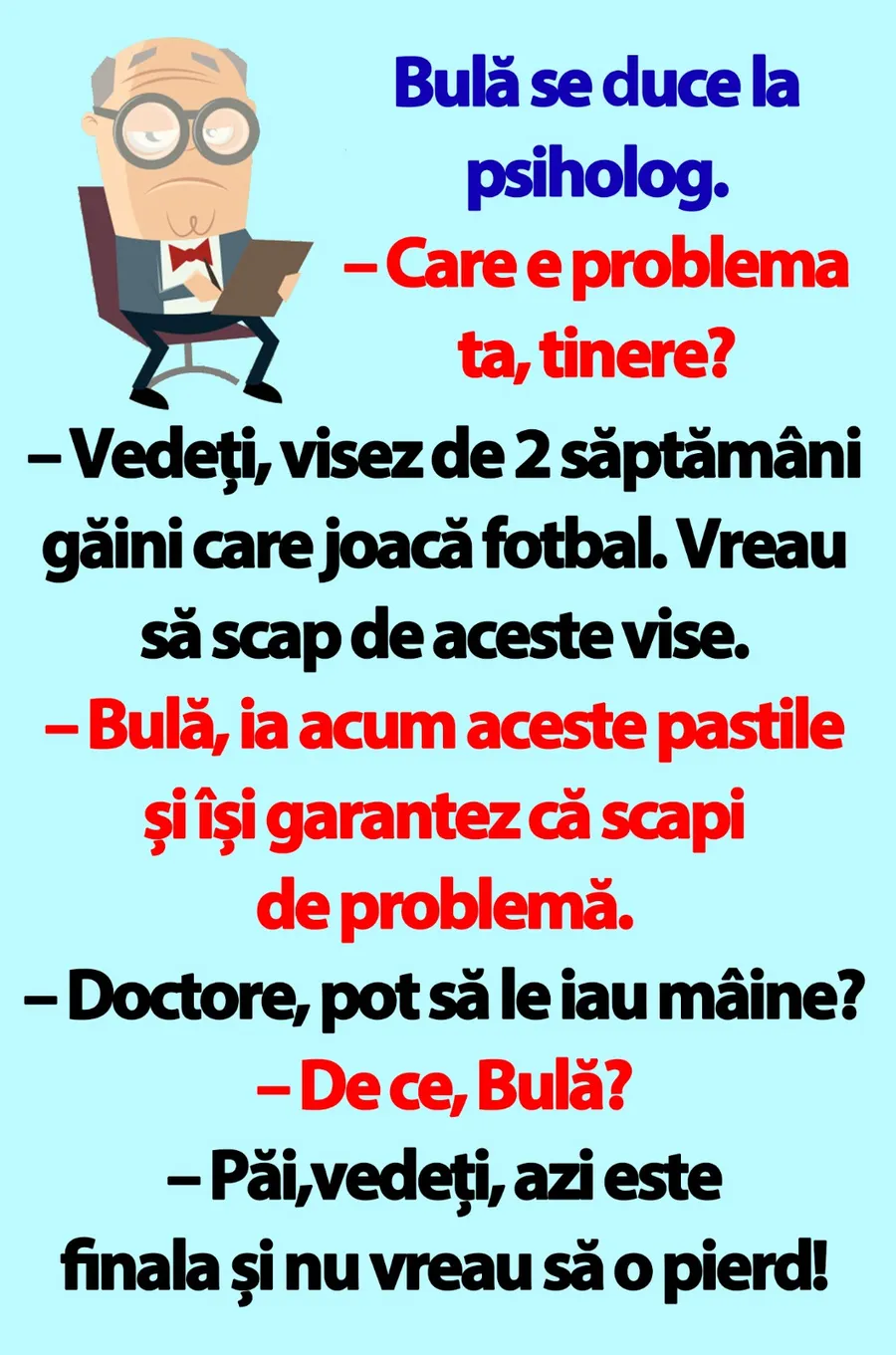 – Vedeți, visez de 2 săptămâni găini care joacă fotbal. Vreau să scap de aceste vise.