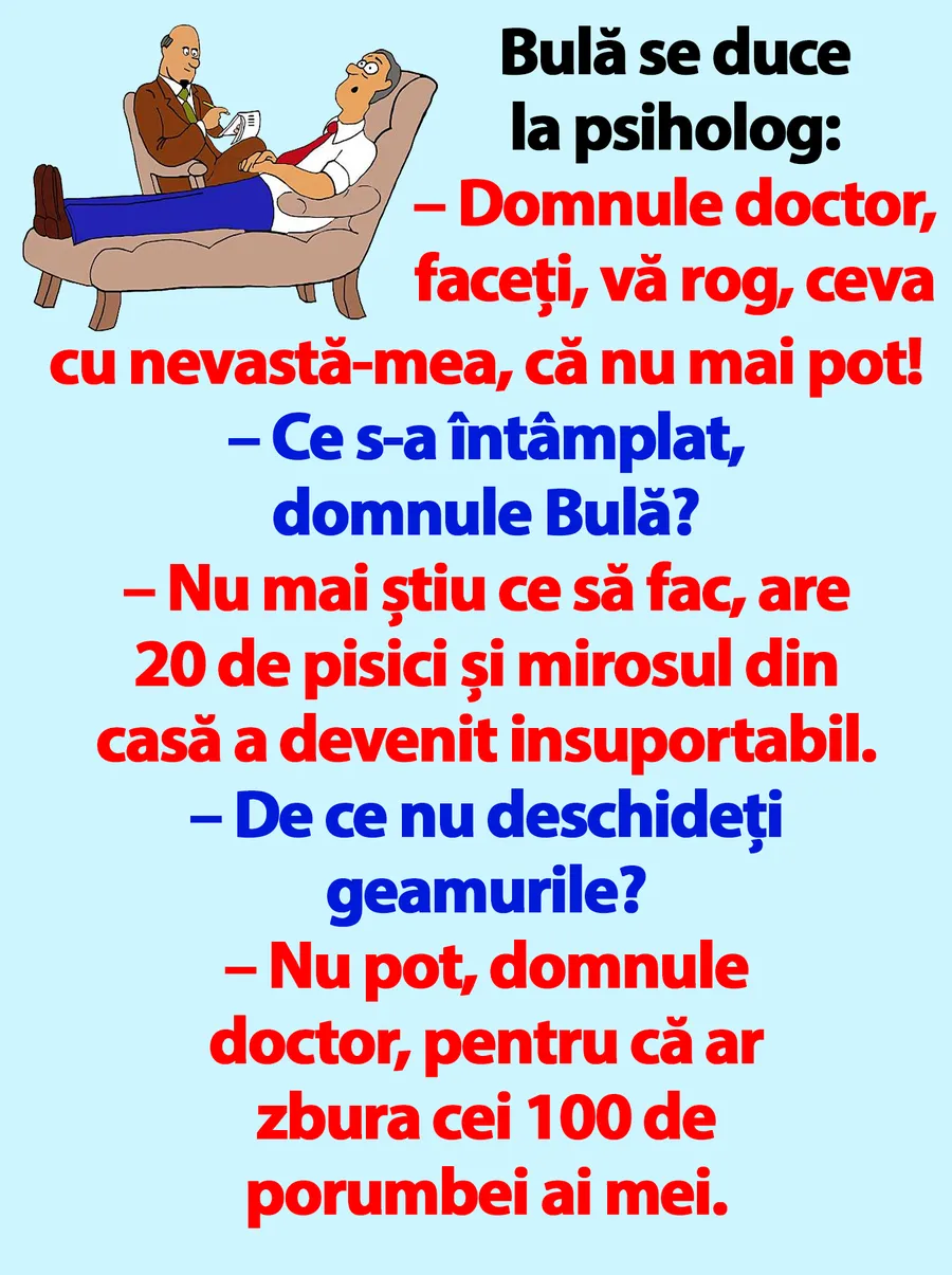 Dragi cititori, CANCAN.RO vrea să vă aducă zâmbetul pe buze în această zi, așa că vă pune la dispoziție un banc amuzant cu Bulă. Dialogul hilar dintre el și medicul psiholog, căruia îi face o vizită. Vei râde cu lacrimi!