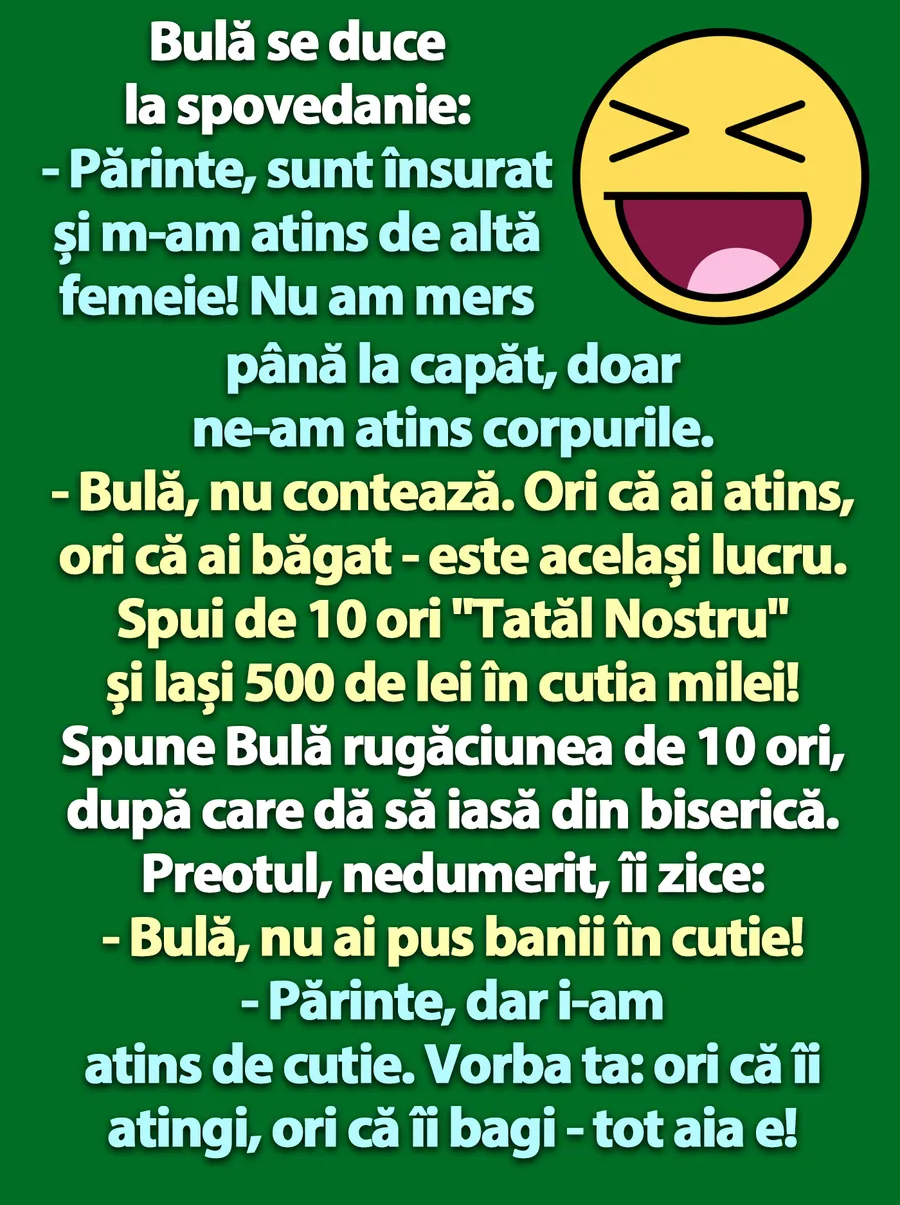 Banc. Este sâmbătă dimineața și este momentul să vă punem un zâmbet pe chip, pentru a începe weekendul cu voie bună. De data aceasta vă prezentăm un banc cu Bulă, care alege să meargă la biserică pentru a se spovedi. Acolo, îi face o mărturisire preotului legată de infidelitate. Părintele îi spune ce trebuie să facă, pentru a fi iertat, dar finalul este neașteptat. Dialogul stârnește amuzamentul. Spor la râs, dragi cititori!