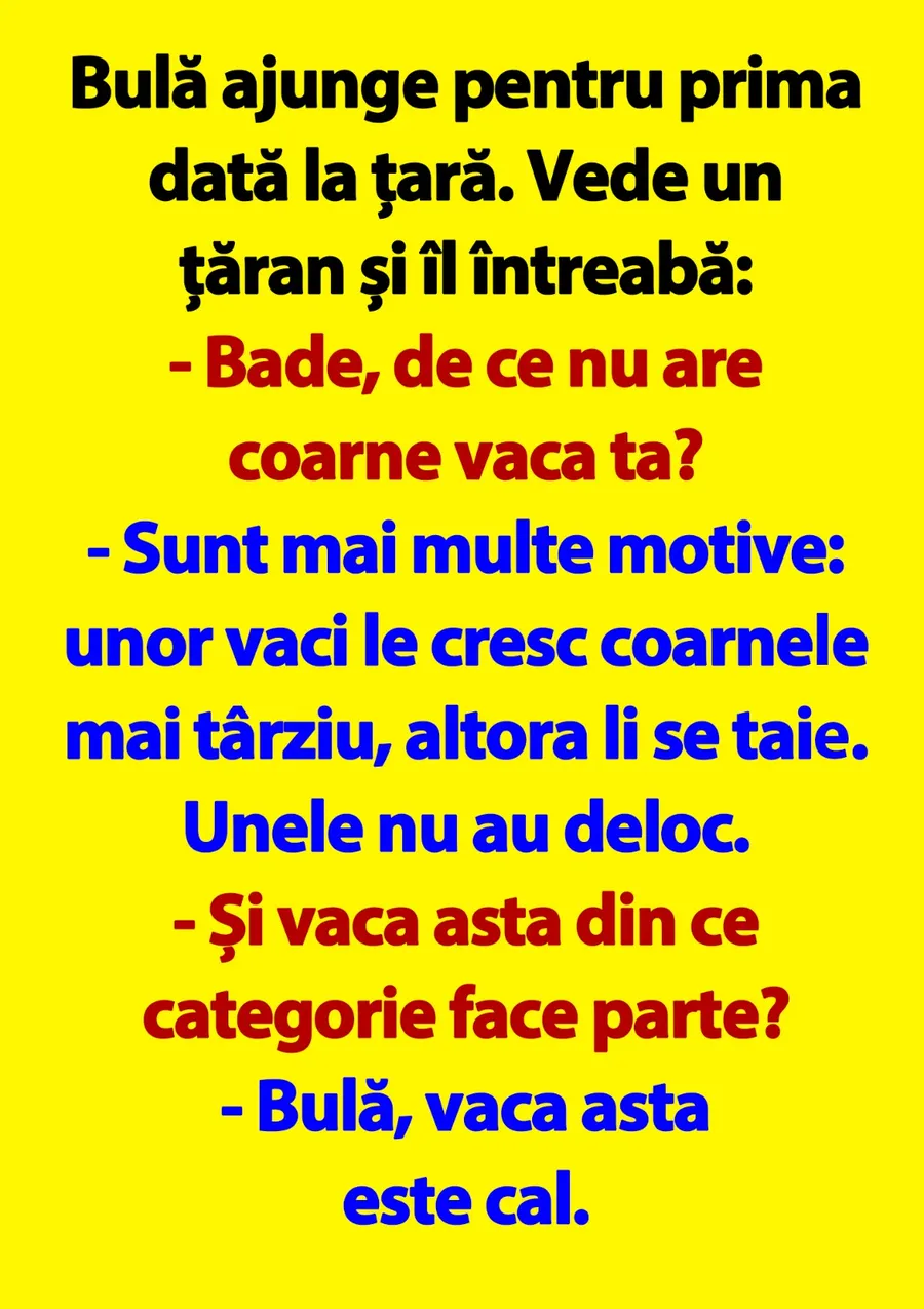 Ziua bună se cunoaște încă de dimineață, așa că trebuie începută cu zâmbetul pe buze. Iar pentru asta am pregătit un banc care cu siguranță te va amuza copios. Protagonistul de astăzi este Bulă, care face o vizită la țară și are mai multe curiozități. Deznodământul este hilar.