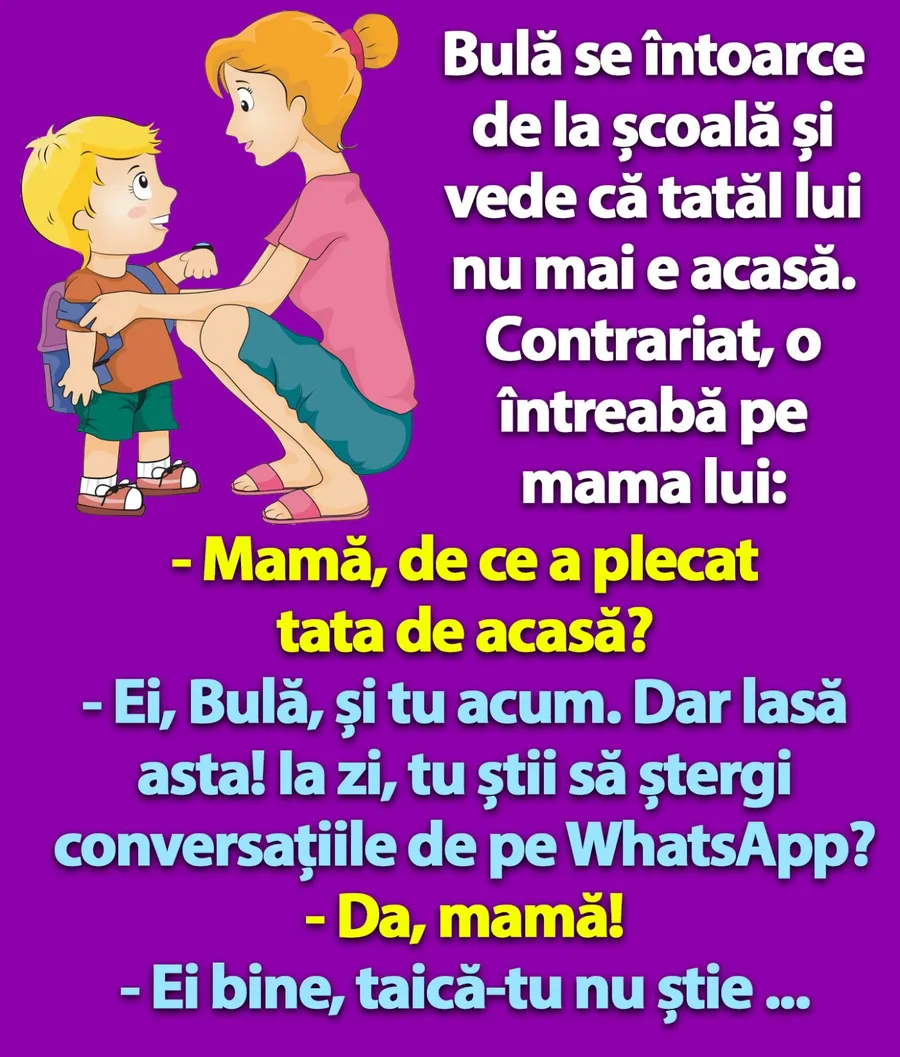 Ziua bună se cunoaște încă de dimineață, așa că trebuie începută cu zâmbetul pe buze. Iar pentru asta am pregătit un banc care cu siguranță te va amuza copios. Protagonistul de astăzi este Bulă. Acesta observă că tatăl său lipsește de acasă, așa că își trage mama la răspundere. Deznodământul este hilar.