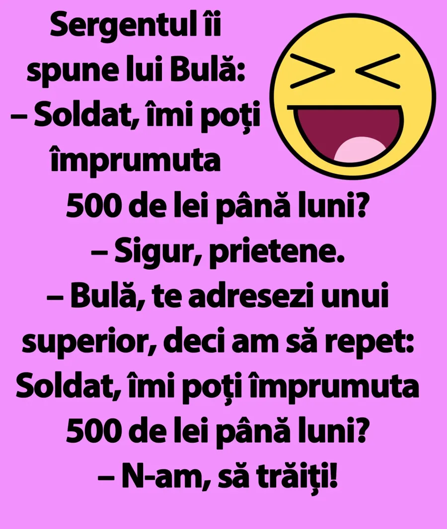 Ziua bună se cunoaște încă de dimineață, așa că trebuie începută cu zâmbetul pe buze. Iar pentru asta am pregătit un banc care cu siguranță te va amuza copios. Protagonistul de astăzi este Bulă. Acesta este în armată, iar un superior îi cere bani împrumut. Deznodământul este hilar.