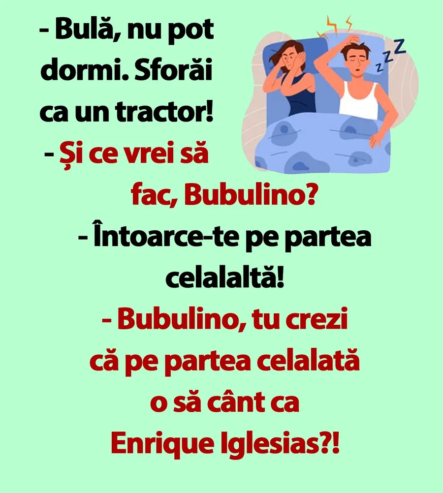 – Bulă, nu pot dormi. Sforăi ca un tractor!