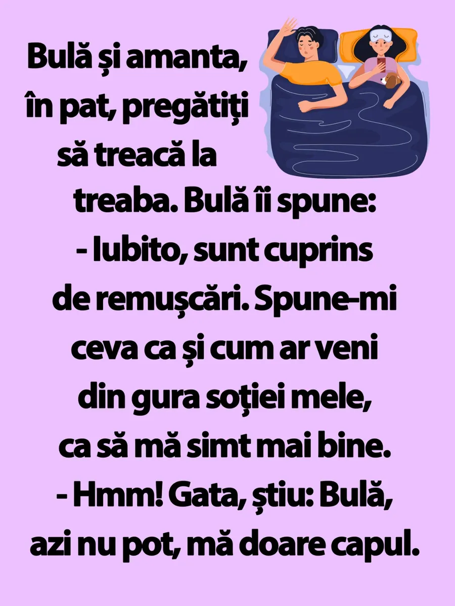 Dragi cititori, weekendul se apropie de final, dar nu ;i distracția. CANCAN.ro vă pune la dispoziție un banc copios ca să vă începeți ziua într-o notă pozitivă. Este important să începeți fiecare zi cu zâmbetul pe buze. O zi în care nu ați râs este o zi pierdută. Protagonistul bancului de azi este celebrul și simpaticul Bulă, care se află în compania amantei.