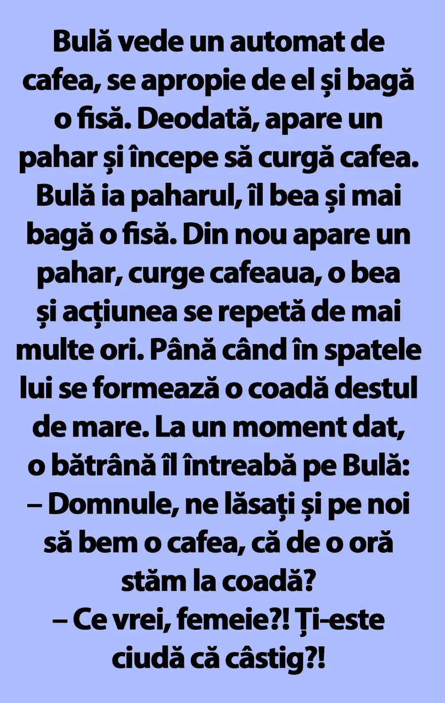 – Domnule, ne lăsați și pe noi să bem o cafea, că de o oră stăm la coadă?