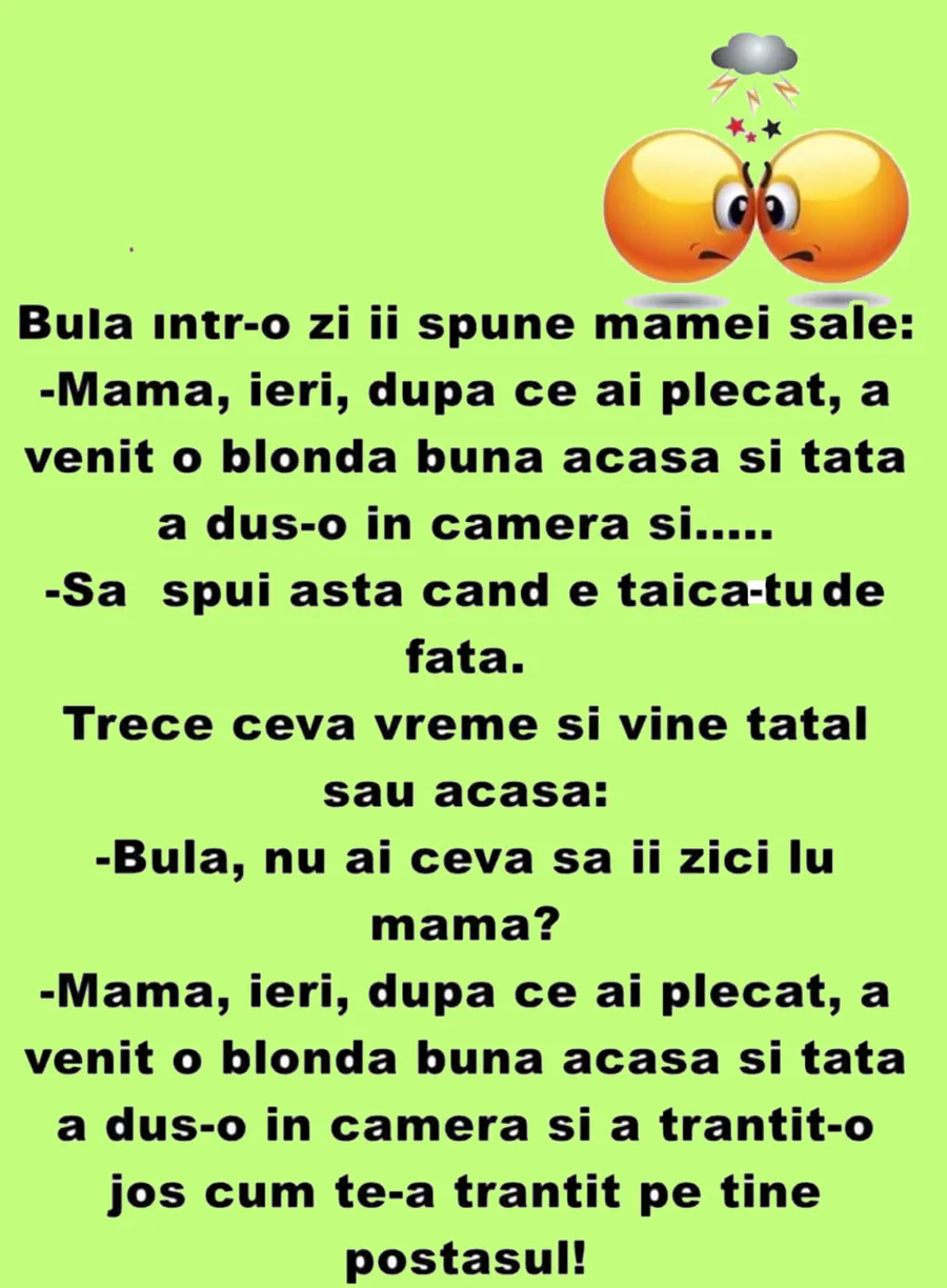 -Mamă, ieri, după ce ai plecat, a venit o blondă bună acasă și tata a dus-o în camera și a trântit-o jos, așa cum te-a trântit pe tine poștașul.
