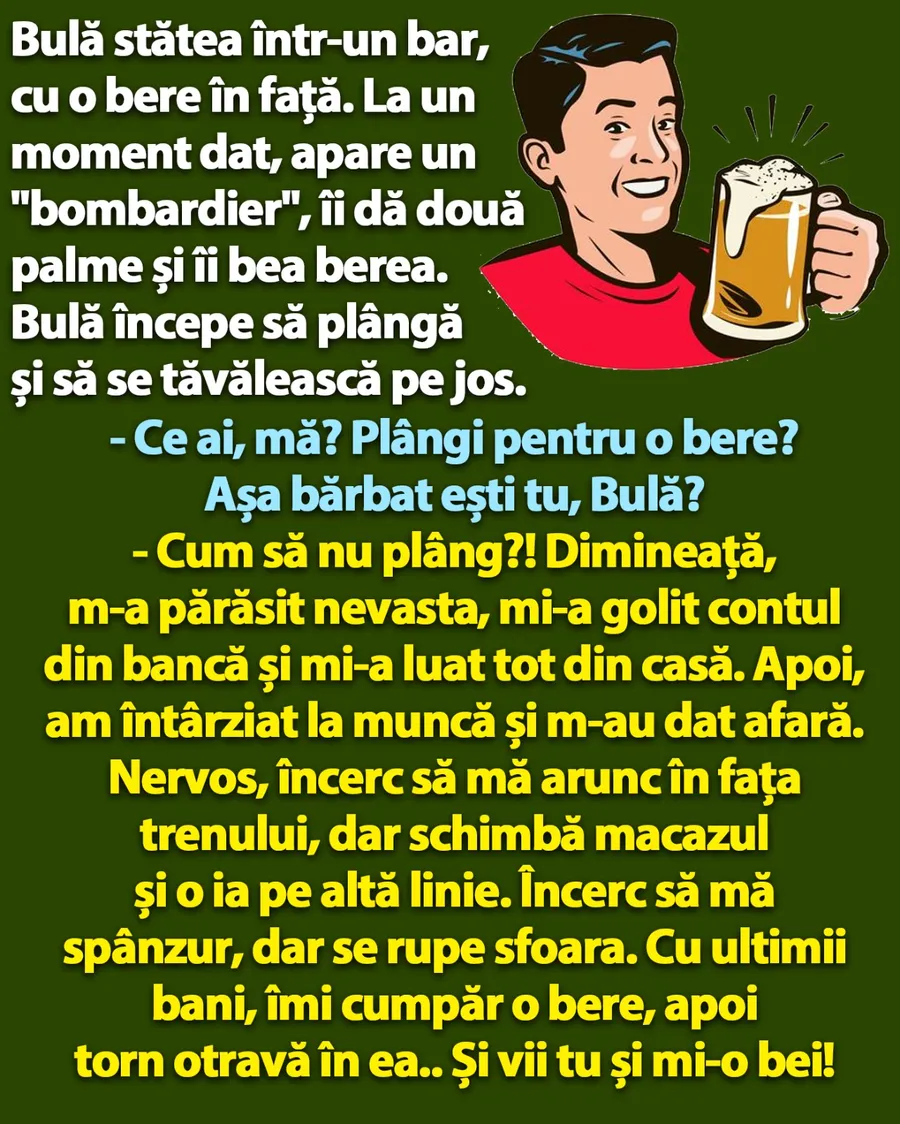 – Ce ai, mă? Plângi pentru o bere? Așa bărbat ești tu, Bulă?