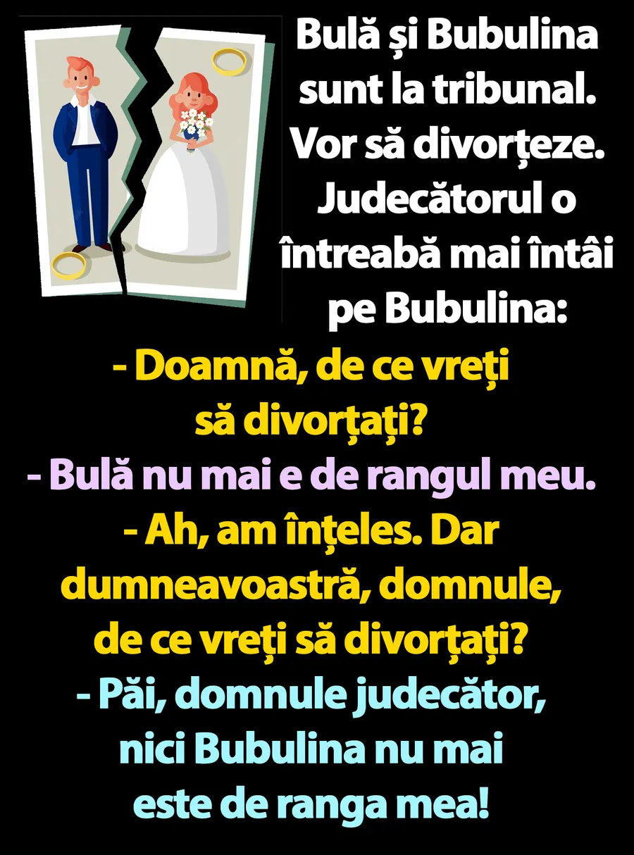 Banc. În această duminică, vă aducem zâmbetul pe chip cu alte bancuri savuroase! De data aceasta, în prim-plan îi avem pe Bulă și Bubulina, care s-au prezentat la tribunal, pentru a divorța. Judecătorul le adresează amândurora câte o întrebare. Dialogul stârnește amuzamentul! Spor la râs, dragi cititori!