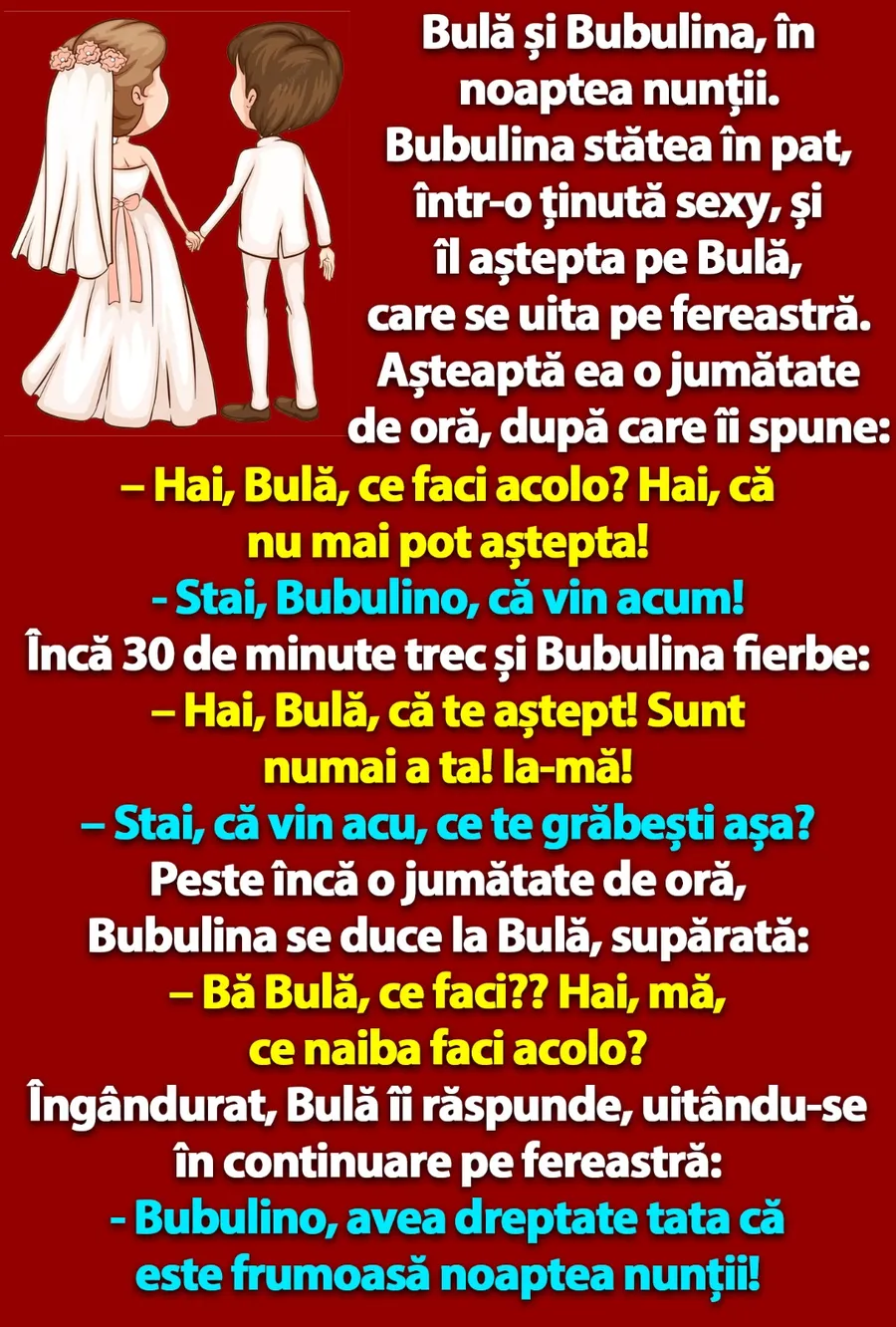 Banc. Bulă și Bubulina se căsătoresc și, apoi, merg să își petreacă împreună noaptea nunții. Atunci, însă, Bubulina începe să își piardă răbdarea din cauza lui Bulă, în timp ce ea îl așteaptă în pat. Vă readucem zâmbetul pe buze cu două bancuri, în această zi de duminică! Dialogul stârnește amuzamentul! Spor la râs, dragi cititori!