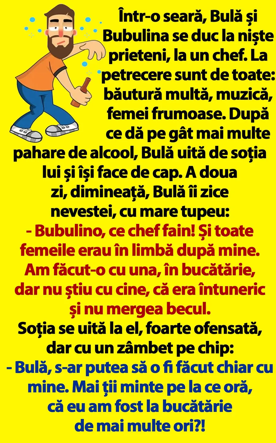 Banc. Este miercuri, iar CANCAN.RO își propune să aducă zâmbetul pe fața fiecărui cititor. Bancul pe care l-am pregătit pentru astăzi este unul epic! Bulă și Bubulina se duc la niște prieteni, la un chef. Ce s-a întâmplat mai departe, urmărește în rândurile de mai jos.
