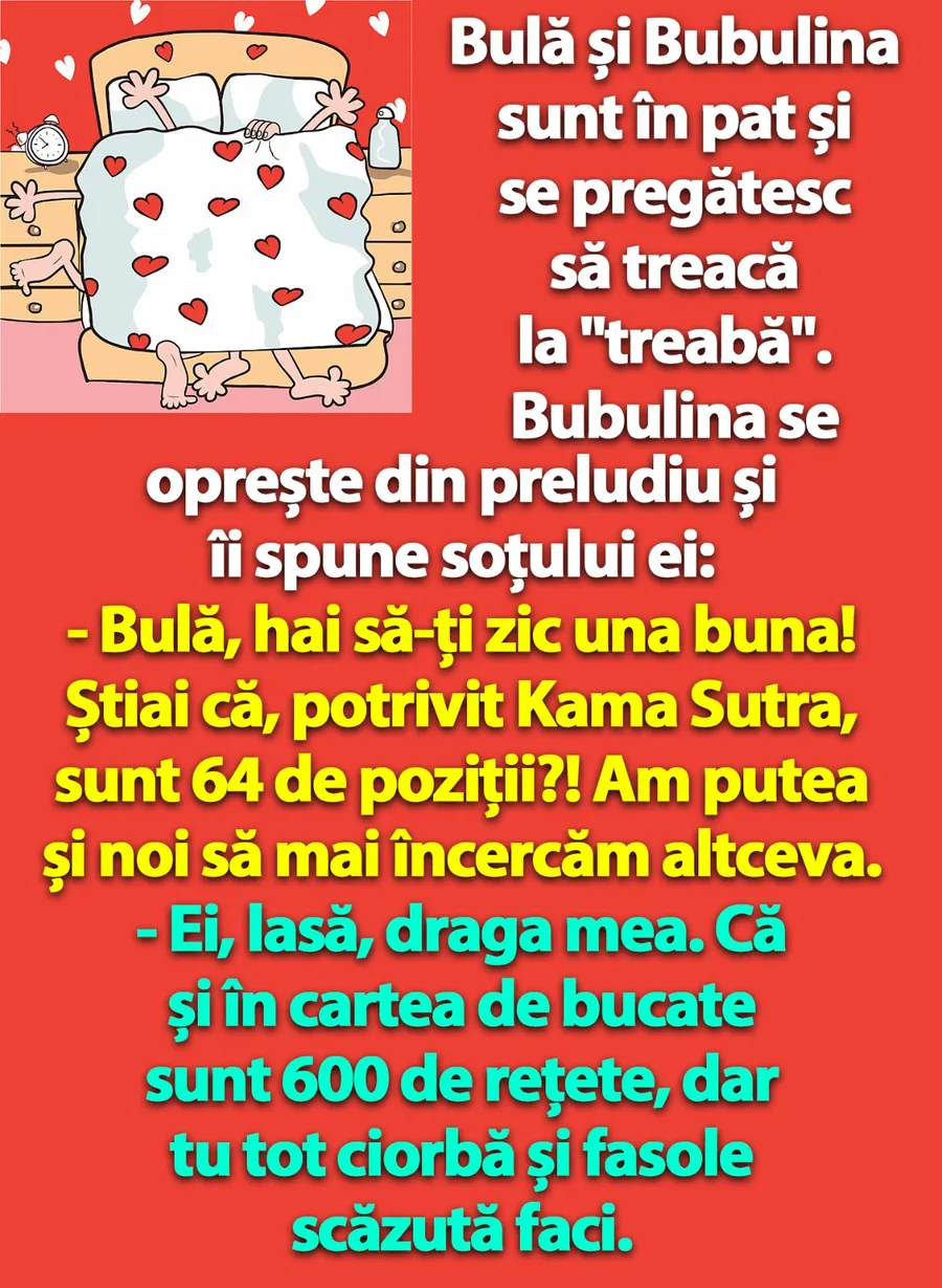 – Bulă, hai să-ți zic una buna! Știai că, potrivit Kama Sutra, sunt 64 de poziții?! Am putea și noi să mai încercăm altceva.