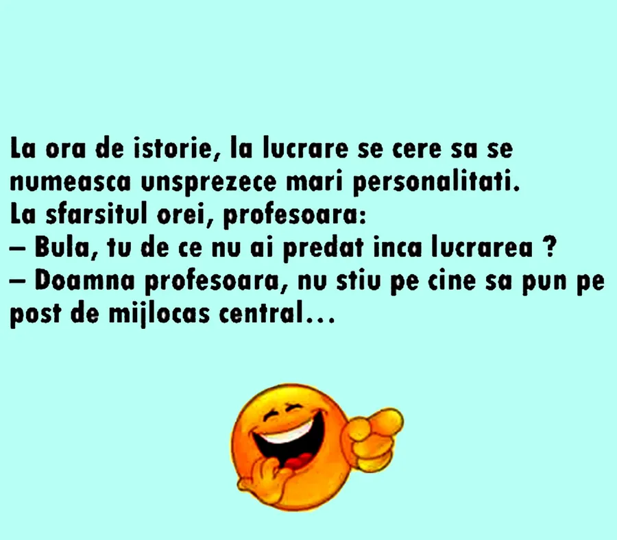 Dragi cititori, CANCAN.RO a pregătit un banc savuros cu Bulă, personajul preferat al românilor. Acesta are parte de o lucrare de control la ora de istorie, însă nu reușește să termine la timp. Replica pe care i-o dă profesoarei va stârni hohote de râs. Spor la voie bună!