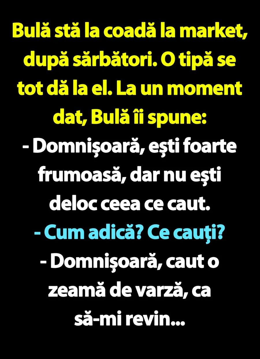 O zi bună trebuie să se încheie cu o porție copioasă de râs, iar pentru asta am pregătit un banc care cu siguranță o să îți aducă zâmbetul pe buze. Protagonistul este Bulă, care merge la supermarket după sărbători. Acolo întâlnește o tipă, iar deznodământul este hilar.