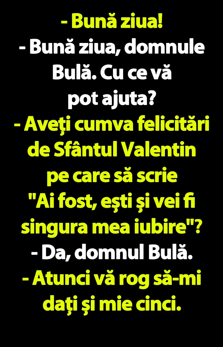 – Aveți cumva felicitări de Sfântul Valentin pe care să scrie „Ai fost, ești și vei fi singura mea iubire”?