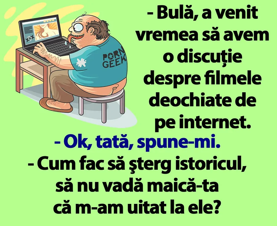 Dragă cititorule, CANCAN.RO ți-a pregătit un banc de nota 10. Este vineri, 1 martie 2024 – prima zi de primăvară din acest an și e musai să termini această săptămână cu zâmbetul pe buze. Bulă și tatăl lui au o discuție tare haioasă despre filmele deocheate. Spor și voie bună!