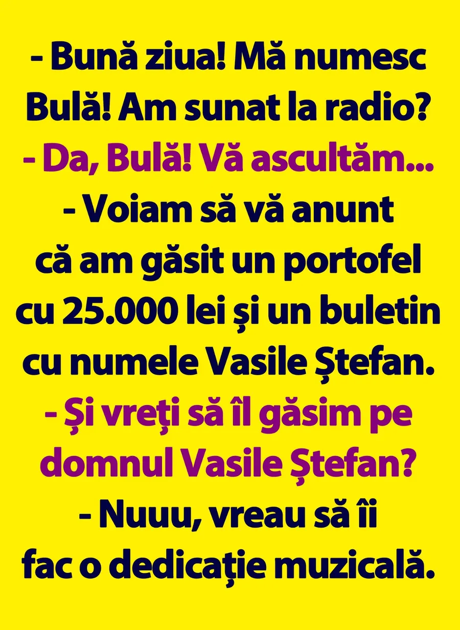 Ziua bună se cunoaște încă de dimineață, așa că trebuie începută cu zâmbetul pe buze. Iar pentru asta am pregătit un banc care cu siguranță o să te amuze copios. Protagonistul de astăzi este Bulă. Acesta sună la radio, iar deznodământul este hilar.