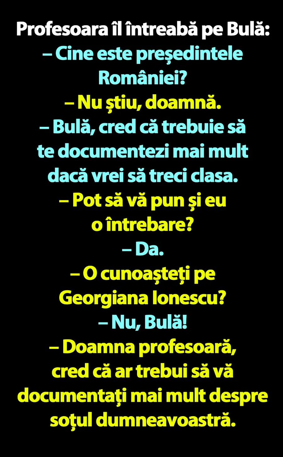 CANCAN.RO ți-a pregătit bancul zilei! Bulă și profesoara lui au o discuție tare haioasă. Ești pregătit să râzi cum nu ai mai făcut-o de mult? Îți dorim spor și voie bună!