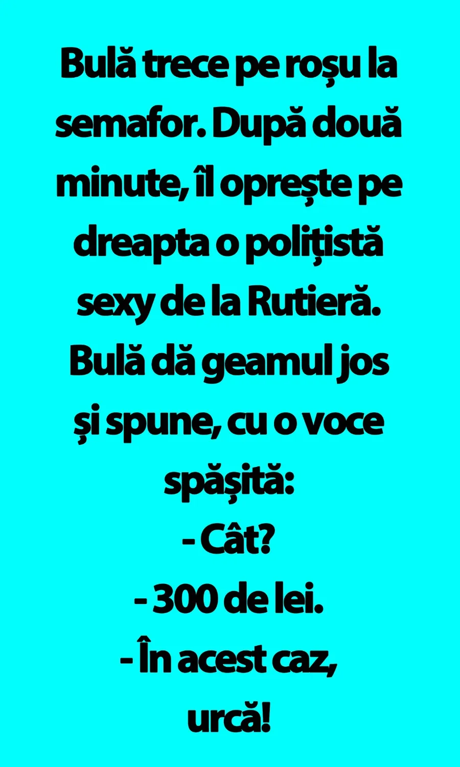 Bulă trece pe roșu la semafor. După două minute, îl oprește pe dreapta o polițistă sexy de la Rutieră. Bulă dă geamul jos și spune, cu o voce spășită: