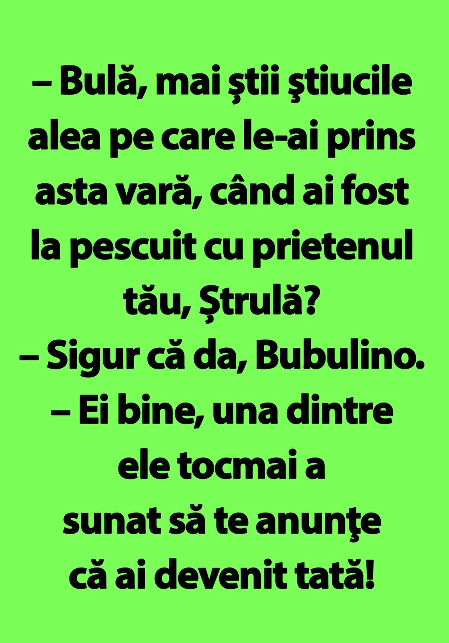 – Bulă, mai știi ştiucile alea pe care le-ai prins asta vară, când ai fost la pescuit cu prietenul tău, Ștrulă?
