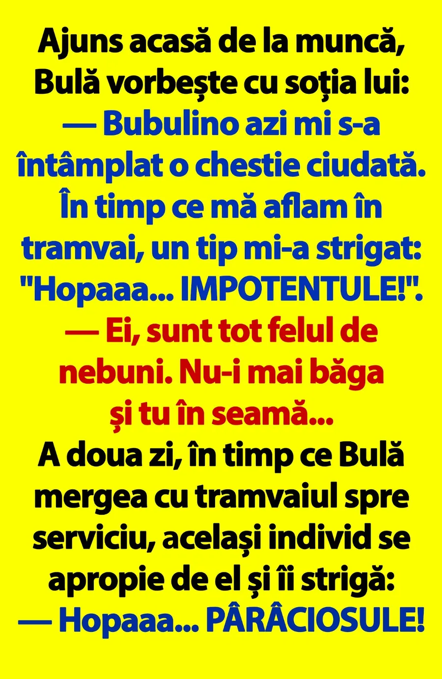 — Bubulino azi mi s-a întâmplat o chestie ciudată. În timp ce mă aflam în tramvai, un tip mi-a strigat: „Hopaaa… IMPOTENTULE!”.