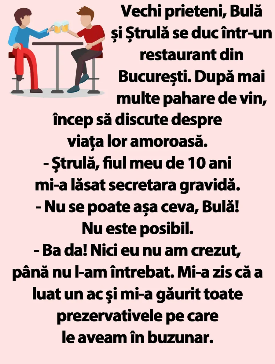 Pentru a începe a bine această dimineață, CANACAN.RO îți propune să citești această glumă, care sigur te va face să râzi. Sâmbătă ce tocmai a trecut și poate ai ieșit în oraș, cum de altfel au făcut și personajele bancului nostru. Bulă și Ștrulă, doi vechi prieteni iubiți de toată lumea merg la un restaurant din București. Iar după câteva pahare de vin, discuția începe să fie savuroasă. La final, bineînțeles, va stârni hohote de râs. Spor la citit și voie bună!