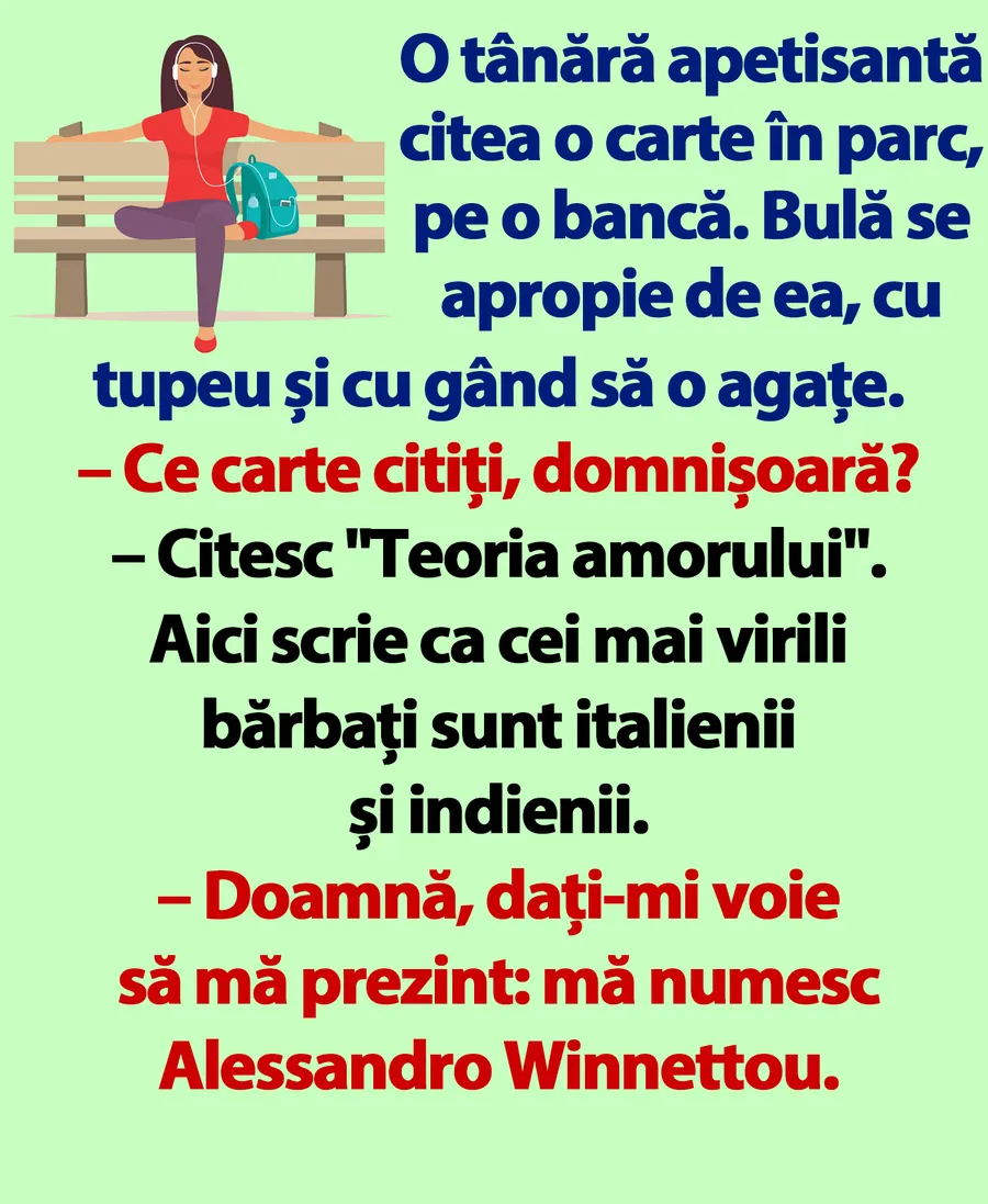 ”O tânără apetisantă citea o carte în parc, pe o bancă. Bulă se apropie de ea, cu tupeu și cu gând să o agațe.