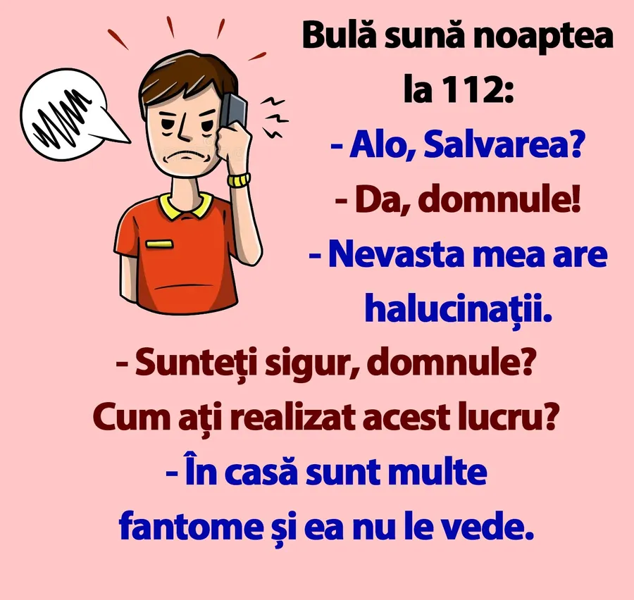 Banc. Este dimineață, moment în care ar fi ideal să vă începeți ziua cu zâmbetul pe buze. De data aceasta, în centrul atenției se află celebrul Bulă, un personaj îndrăgit încă din perioada comunismului. Bulă apelează numărul de urgență 112 și susține că soția lui are halucinații. Dialogul stârnește amuzamentul, așa că spor la râs!