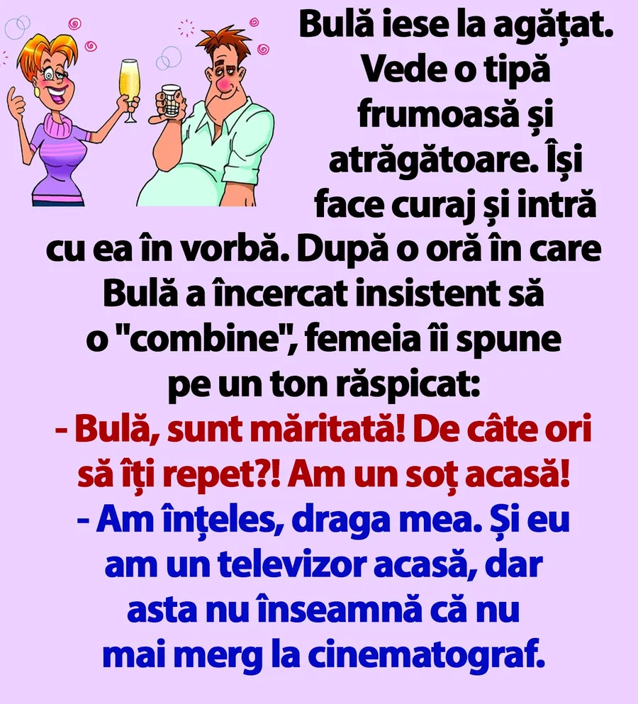 „Bulă iese la agățat. Vede o tipă frumoasă și atrăgătoare. Își face curaj și intră cu ea în vorbă. După o oră în care Bulă a încercat insistent să o „combine”, femeia îi spune pe un ton răspicat: