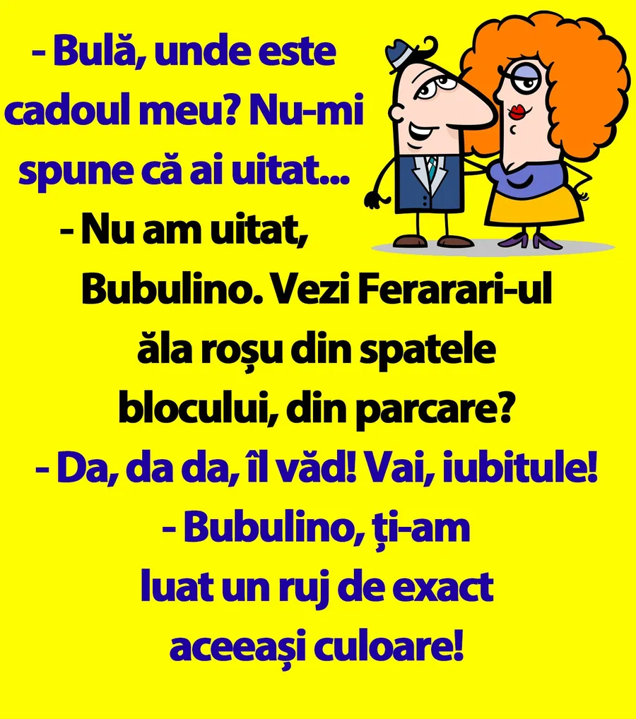 Ziua bună se cunoaște încă de dimineață și trebuie începută cu zâmbetul pe buze. Iar pentru asta am pregătit un banc care cu siguranță te va amuza copios. Protagoniștii de astăzi sunt Bulă și Bubulina. El îi face ei un cadou, iar deznodământul este hilar.