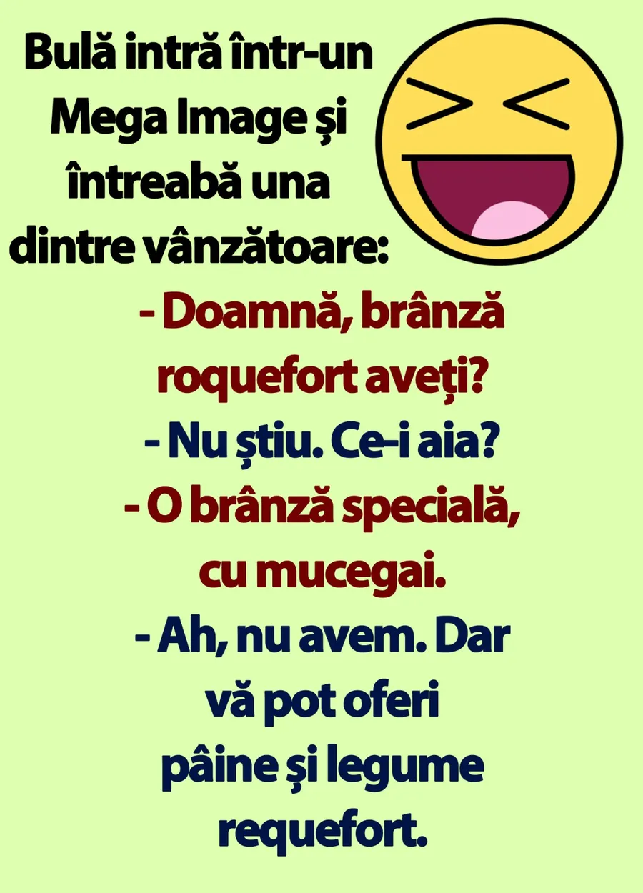 Dragă cititorule, CANCAN.RO îți înseninsează ziua și iți aduce zâmbetul pe buze. Ți-am pregătit un banc de nota 10. Bulă vrea să cumpere brânză roquefort din Mega Image.