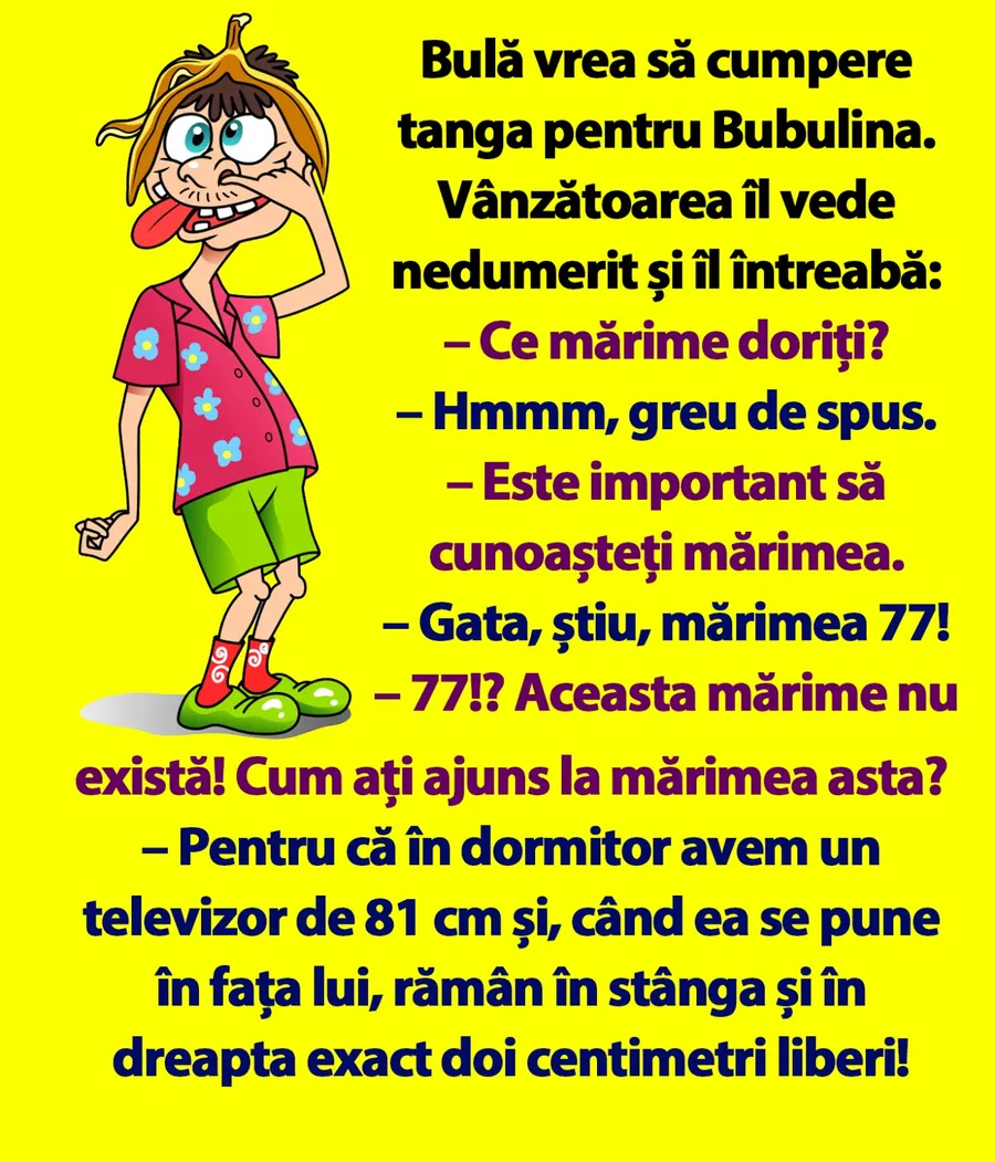 Dragă cititorule, CANCAN.RO ți-a pregătit bancul săptămânii. Bulă vrea să-i facă o surpriză Bubulinei și merge la magazin să-i cumpere lenjerie intimă. Discuția dintre el si vânzătoare te va amuza copios. Spor și voie bună!