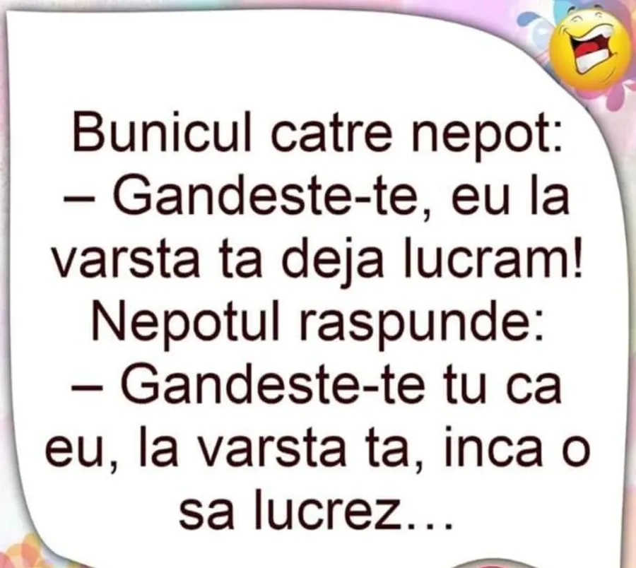 Dragi cititori, CANCAN.RO vă prezintă un banc savuros, menit să vă aducă zâmbetul pe buze. Așadar, nu mai stați pe gânduri și bucurați-vă de următoarea glumă inspirată din realitate. Este vorba despre un dialog între un bunic și nepotul său. Spor la râsete și voie bună!