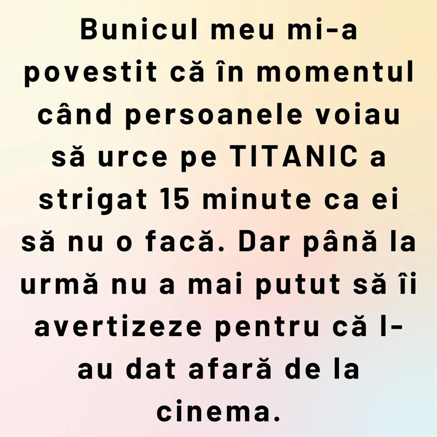 ”Bunicul meu mi-a povestit că în momentul când persoanele voiau să se urce pe TITANIC a strigat 15 minute ca ei să nu o facă. Dar până la urmă, nu a mai putut să îi avertizeze pentru că l-au dat afară de la cinema”, este bancul zilei.