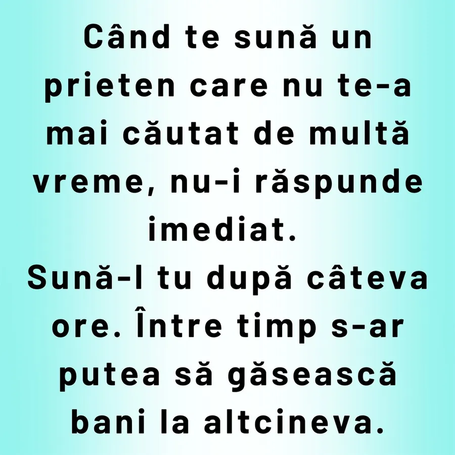 Când te sună un prieten care nu te-a mai căutat de multă vreme, nu-i răspunde imediat. Sună-l tu după câteva ore. Între timp s-ar putea să găsească bani la altcineva.