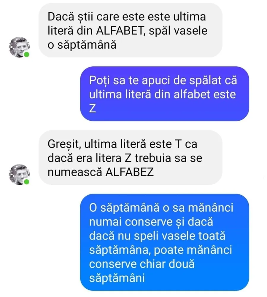 „-Dacă știi care este ultima literă din ALFABET, spăl vasele o săptămână.