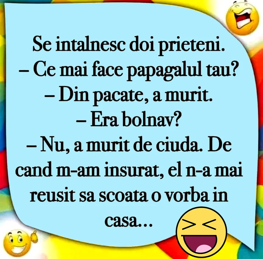 -Nu, a murit de ciudă. De când m-am însurat, el n-a mai reușit să scoată o vorbă în casă…”, este bancul zilei.