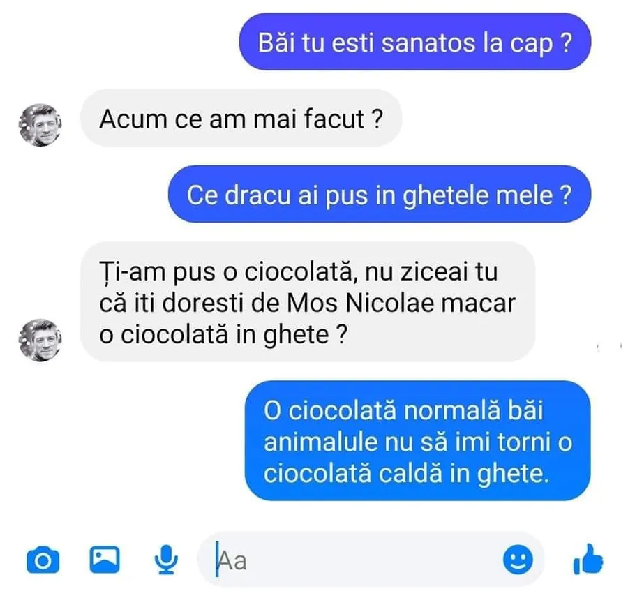 -Ți-am pus o ciocolată, nu ziceai tu că îți dorești de Moș Nicolae măcar o ciocolată în ghete?