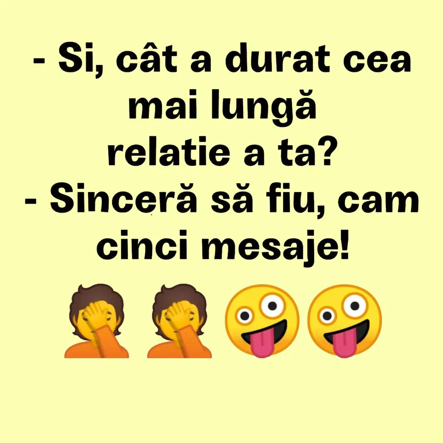 Dragi cititori, CANCAN.RO vă prezintă un banc de nota 10, menit să vă aducă zâmbetul pe buze în această zi caniculară. Întrebat cât a durat cea mai lungă relație a sa, un bărbat dă o replică fabuloasă.