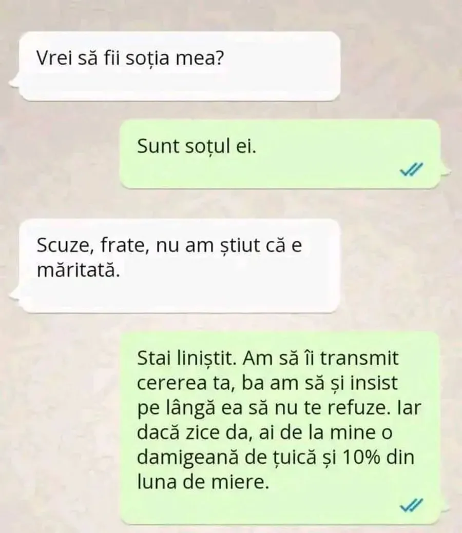 – Stai liniștit. Am să îi transmit cererea ta, ba am să și insist pe lângă ea să nu te refuze. Iar dacă zice da, ai de la mine o damigeană de țuică și 10% din luna de miere.