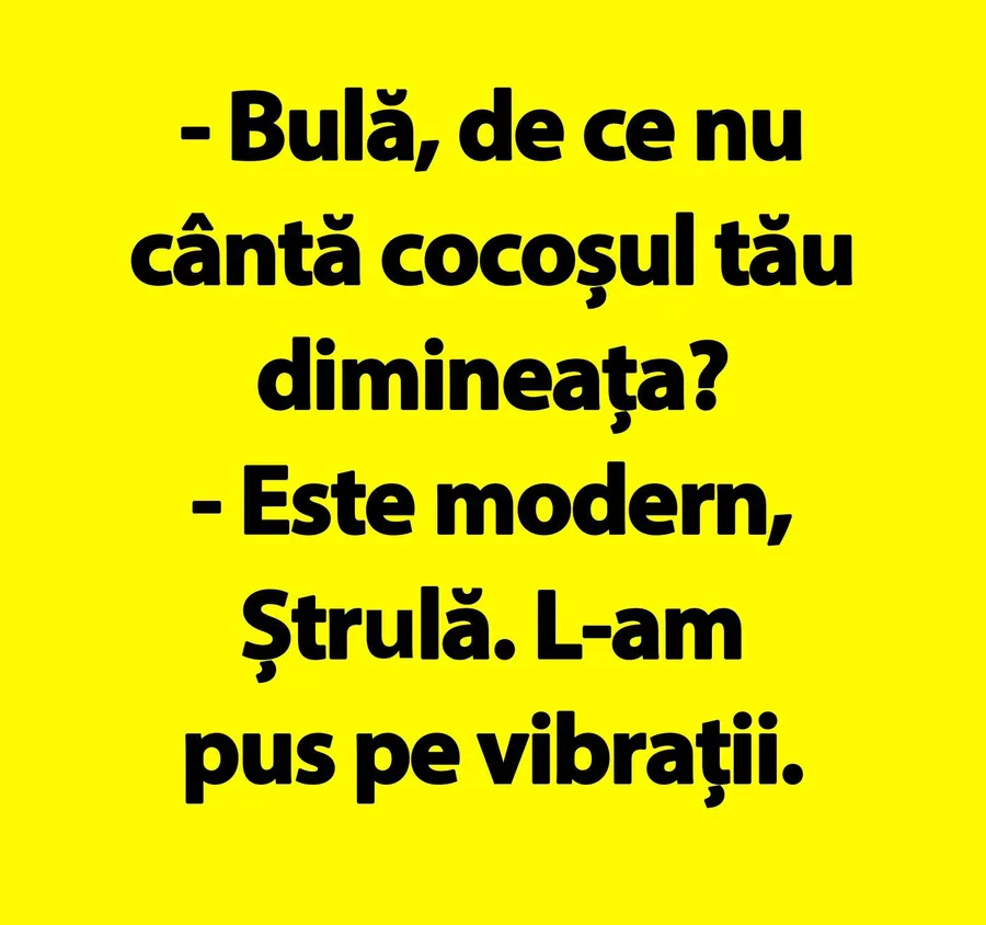 CANCAN.RO ți-a pregătit bancul zilei! Gluma de astăzi te va face să râzi cu gura până la urechi, așa că pune tot pe pauză și bucură-te împreună cu noi. Bulă îi spune lui Ștrulă de ce cocoșul lui nu cântă de dimineața.