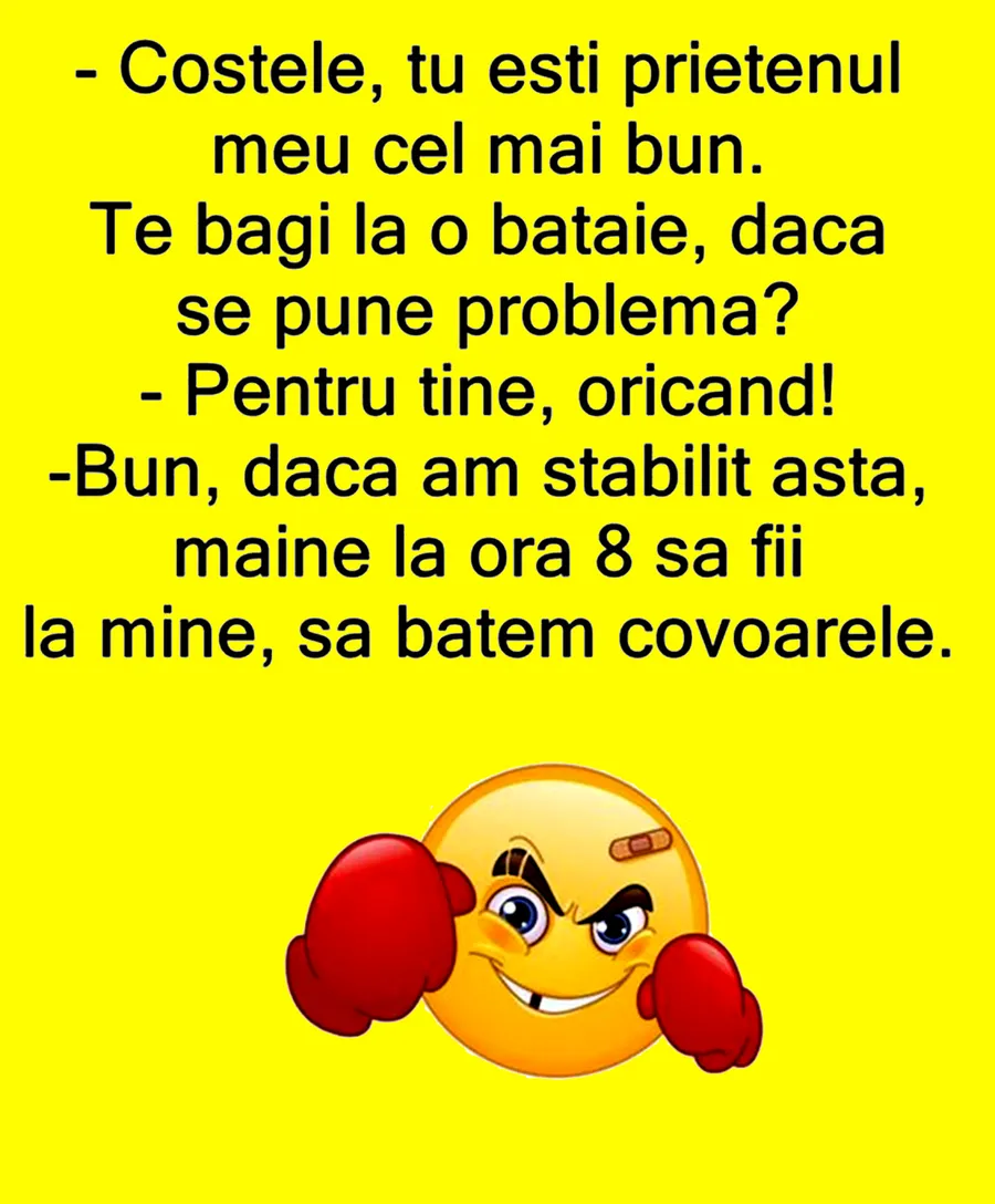 – Bun, dacă am stabilit asta, mâine la ora 8 să fii la mine, să batem covoarele.