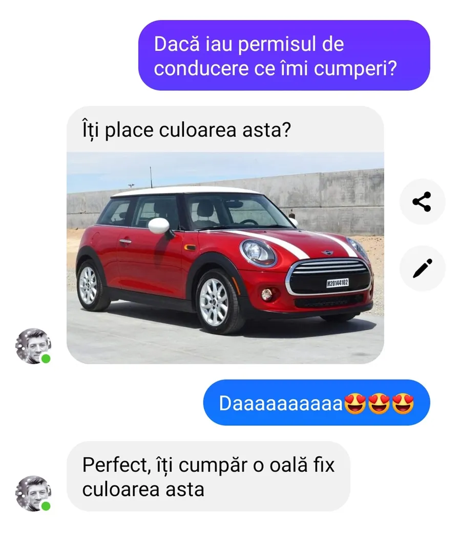 – Îți place culoarea asta? (n.r. atașat o poză cu o mașină roșie)