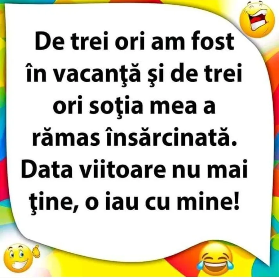 ”De 3 ori am fost în vacanță și de 3 ori soția mea a rămas însărcinată. Data viitoare nu mai ține, o iau cu mine!”, este bancul zilei.