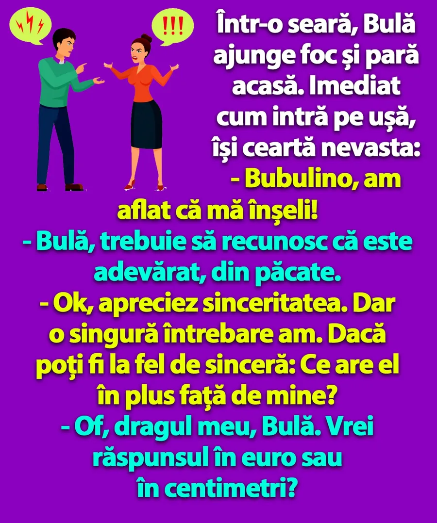 – Da’ când am dormit noi doi împreună, domnu’ Bulă?! replică indignată șefa.